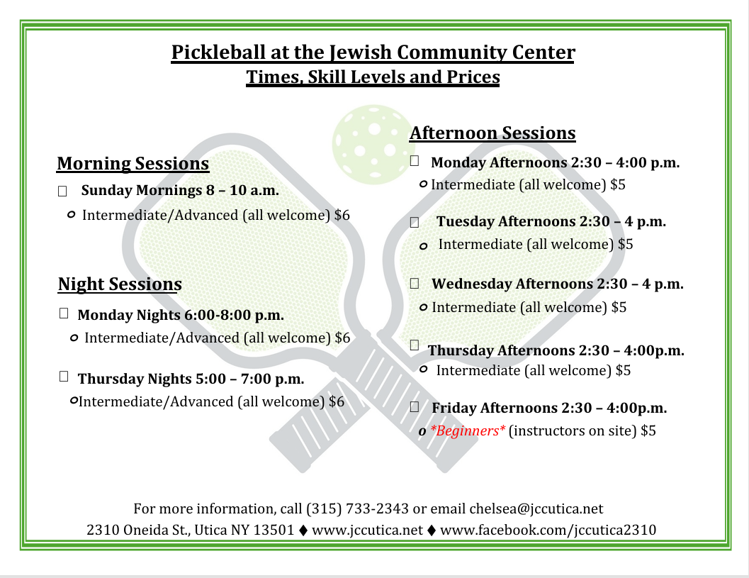 Programming from end of May – end of Sept. is typically played outdoors at the New Hartford Town Park, weather permitting. Rain/humidity/air quality may affect programming and will then be held indoors at the J.C.C. if space is available.